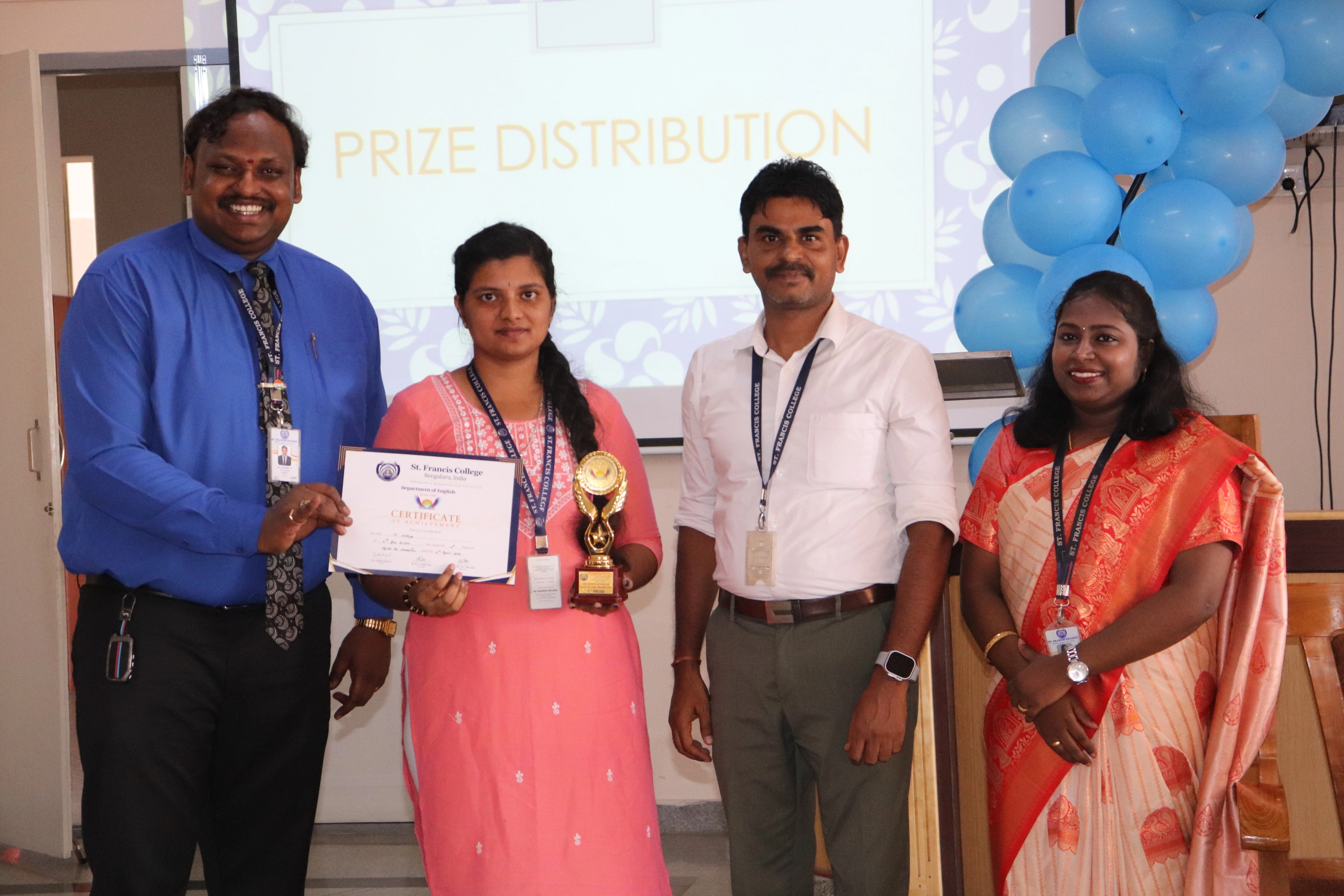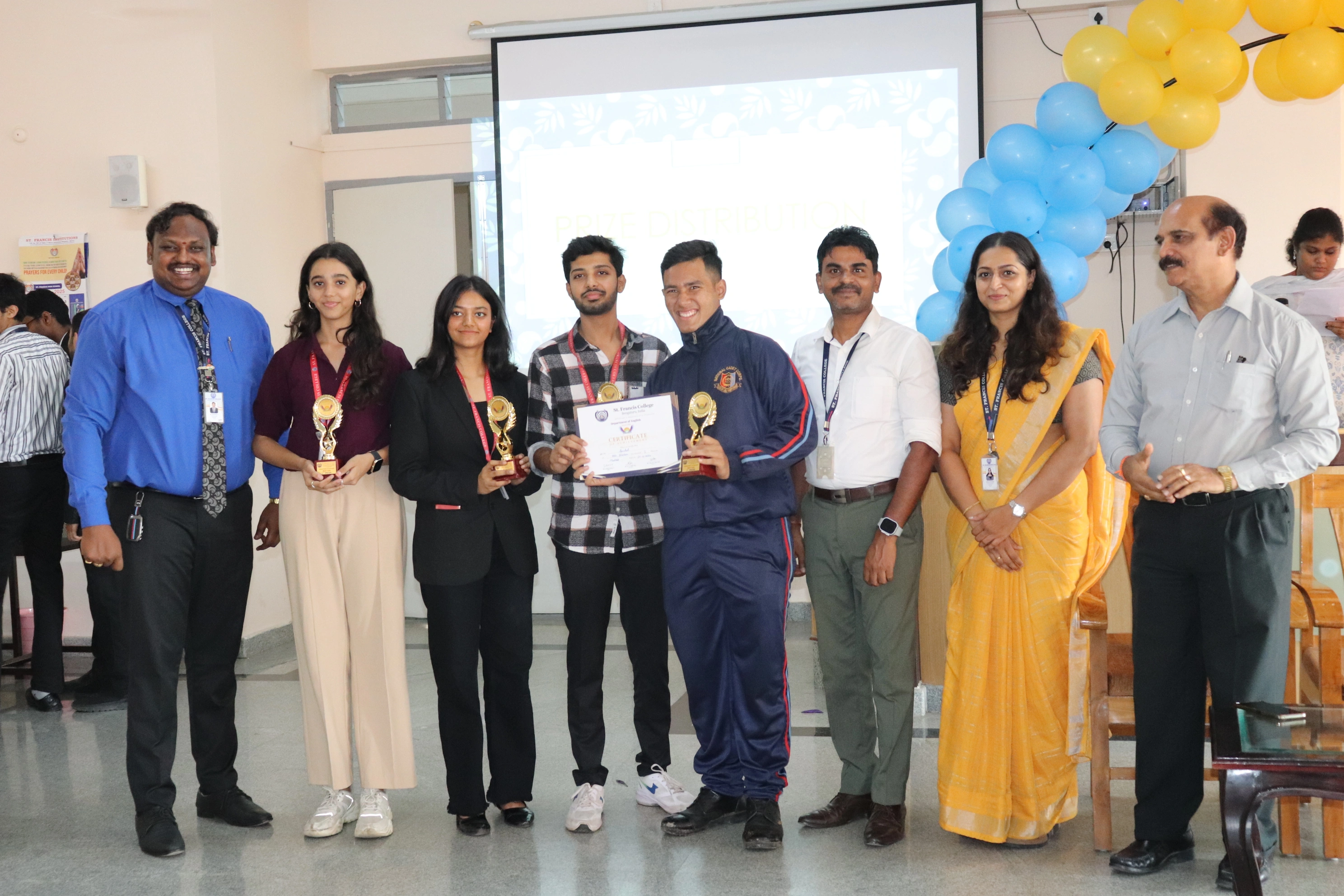 The Department of English, St. Francis College, hosted the Muses Club Achievers’ Day Celebration with great enthusiasm, honouring students for their academic, co-curricular, and leadership achievements. The event was meticulously planned to recognize and appreciate the hard work and dedication of the department’s young achievers.The program began with an Opening Prayer, setting a serene and respectful tone for the proceedings. This was followed by a warm Welcome Address, extending greetings to the dignitaries, faculty, and students in attendance. The Head of the Department, Mr. Satheesh Kumar, delivered a motivating address, appreciating the efforts of students and faculty in fostering a culture of excellence and creativity within the department.One of the highlights of the celebration was the Prize Distribution Ceremony, where students were awarded certificates and awards for outstanding performance in academics and co-curricular activities.The event also featured the Launch of the Annual Muses Club Newsletter, showcasing the club’s vibrant activities, literary contributions, and student achievements over the academic year.