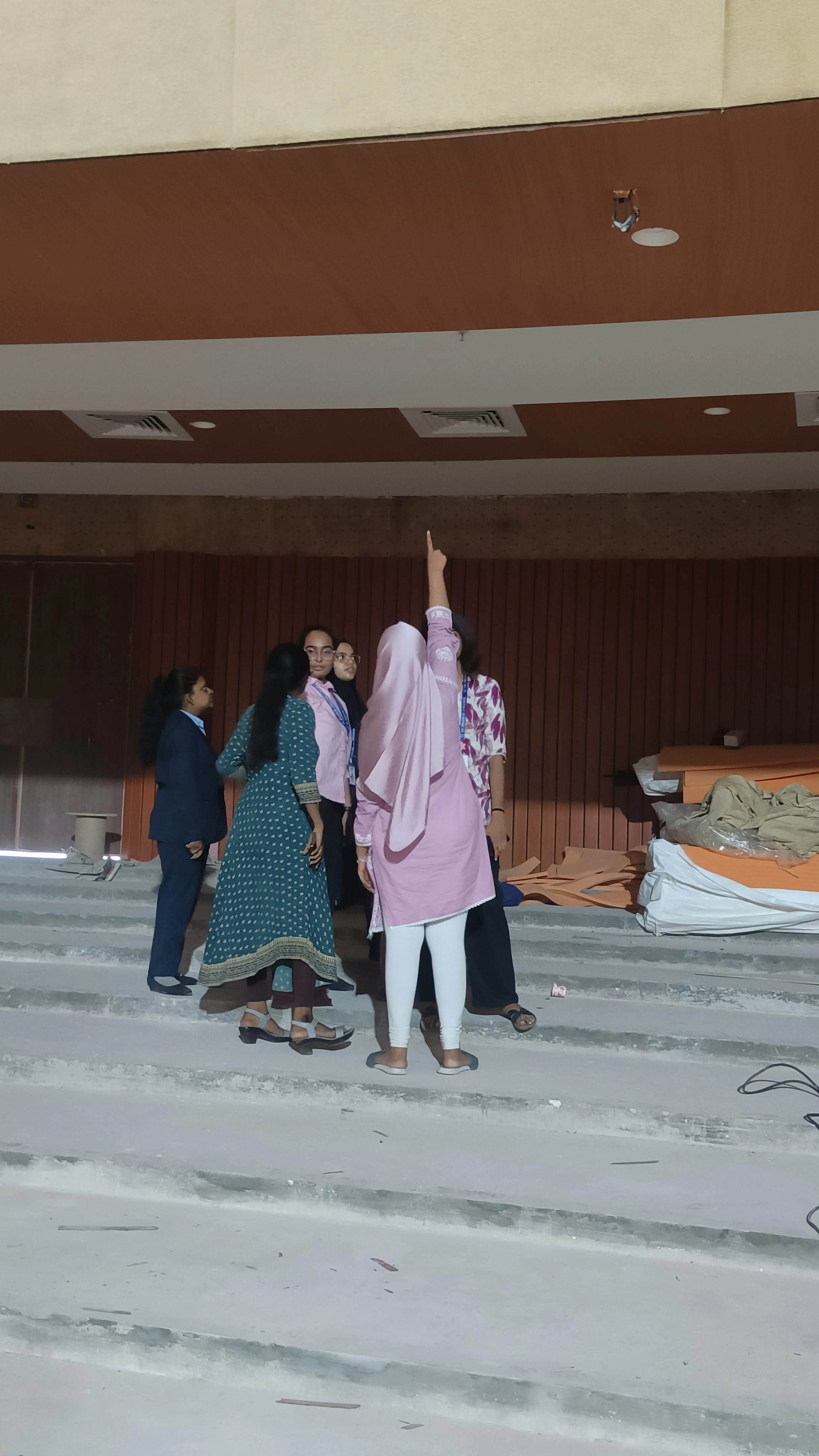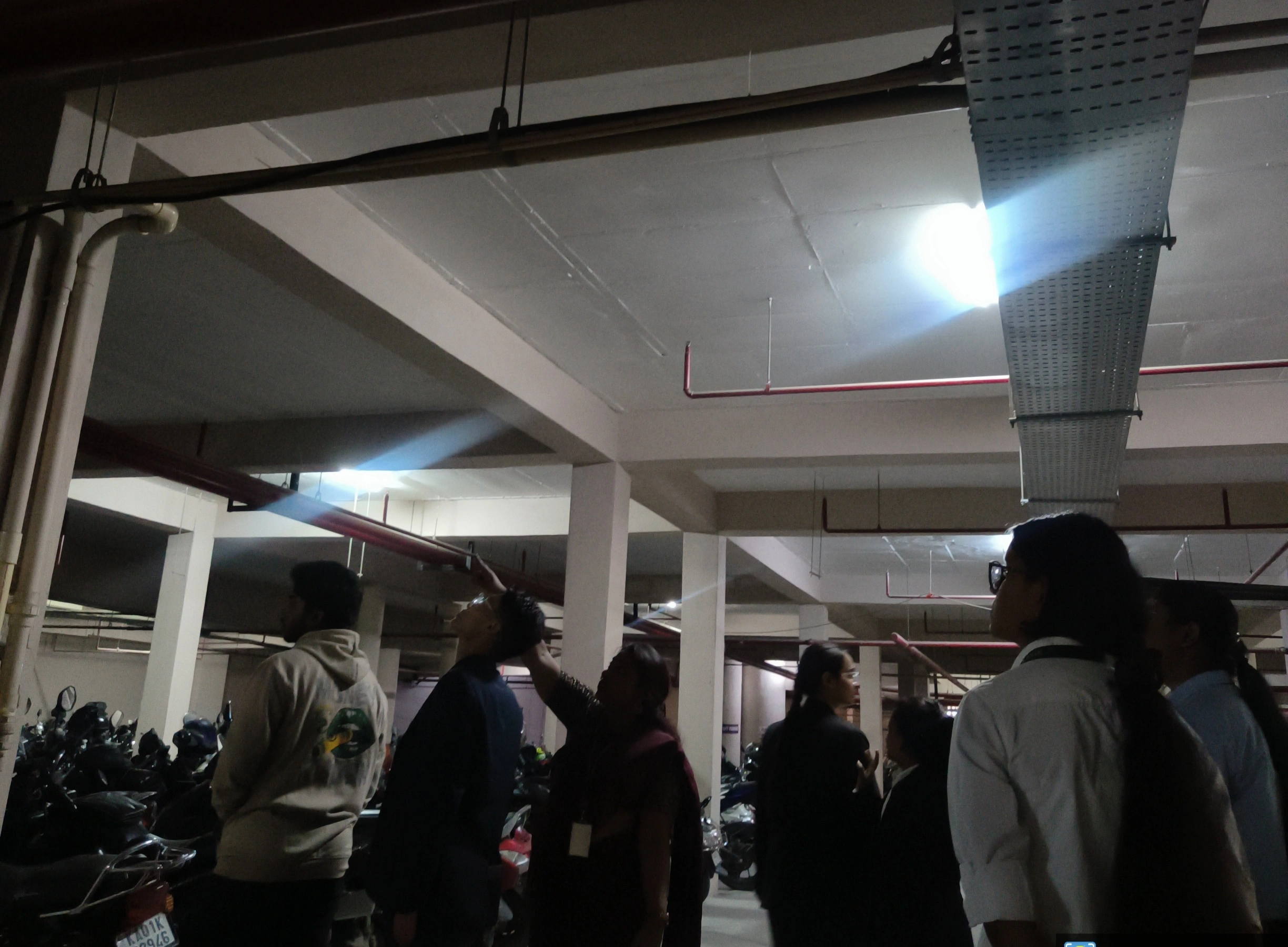 The site visit began with a brief introduction to the fundamental components of building services and their importance in creating comfortable, safe, and functional interior environments. The students were introduced to various interior services such as plumbing, lighting, electrical systems, HVAC, and their role in efficient building performance. This initial briefing helped students understand how these services are integrated into interior design projects.Following the introduction, students were guided through different areas of the campus to observe real-time applications of plumbing layouts, lighting systems, and HVAC installations. Special attention was given to the working process of the Sewage Treatment Plant (STP), where students learned about sustainable water management practices, wastewater treatment, and water reuse systems implemented within the campus.During the walkthrough, students closely observed and analyzed the placement of ducts, lighting fixtures, electrical panels, cable trays, and piping systems. Faculty members encouraged interactive discussions, helping students relate these observations to theoretical concepts studied in the classroom. This hands-on learning approach enhanced students’ understanding of service coordination, spatial planning, and technical integration in interior design projects. Overall, the visit provided valuable practical exposure and strengthened the students’ ability to connect academic knowledge with real-world applications.